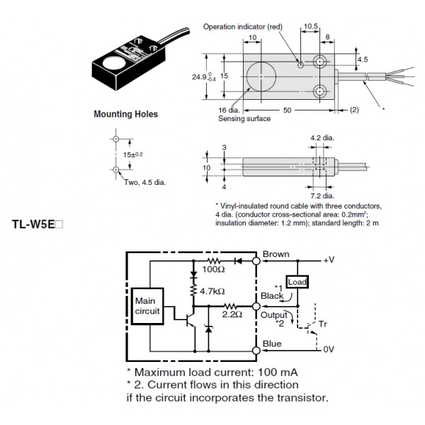 TL-W5E2 este un senzor de proximitate inductiv, paralelipipedic, cu iesire NPN-OC, NC. Distanta de sesizare este de 5 mm. Senzorul este precablat, lungimea cablului fiind 2m.